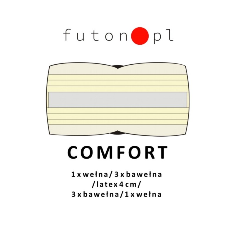 Futon dla zwolenników miękkich i sprężystych materacy. Comfort składa się z 2 warstw wełny, 6 bawełny oraz wkladu z 4 cm płyty latexu. Bawełna i lateks zapewnia optymalne dostosowanie do ciała i wagi a wełna stwarza komfort termiczny. Futon jest bardzo przewiewny i elastyczny.
