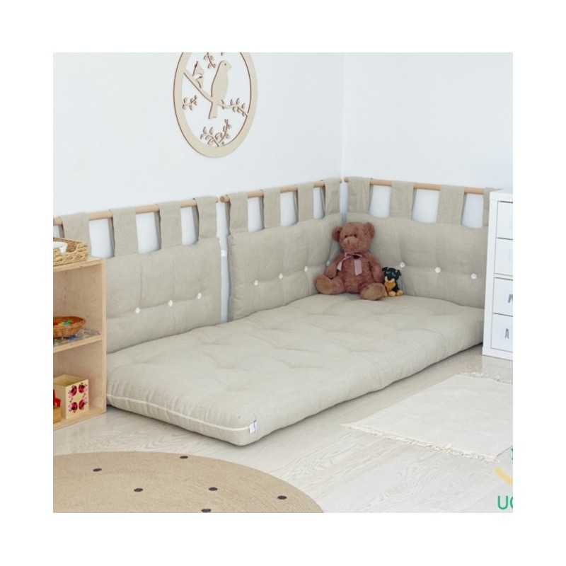 Idealne rozwiązanie do pokoju dziecięcego - zawieszane oparcie na ścianę. Poduszka futon, która nie tylko pełni rolę dekoracyjną i wprowadza "japoński akcent", ale też pozwala stworzyć przyjazny zakątek do zabawy dla malucha.